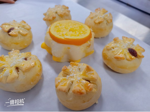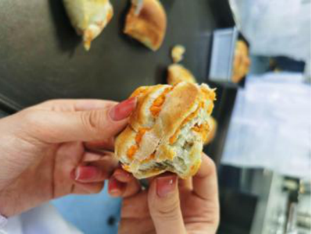 将黄桃酸奶调制秘制流心注入刚出炉的面包,加奥利奥、花生、果干作为点缀,作品由松软的面包、酸甜的果干和甜蜜的流心搭配而成,风味协调而独特,尝过的人都赞不绝口。
