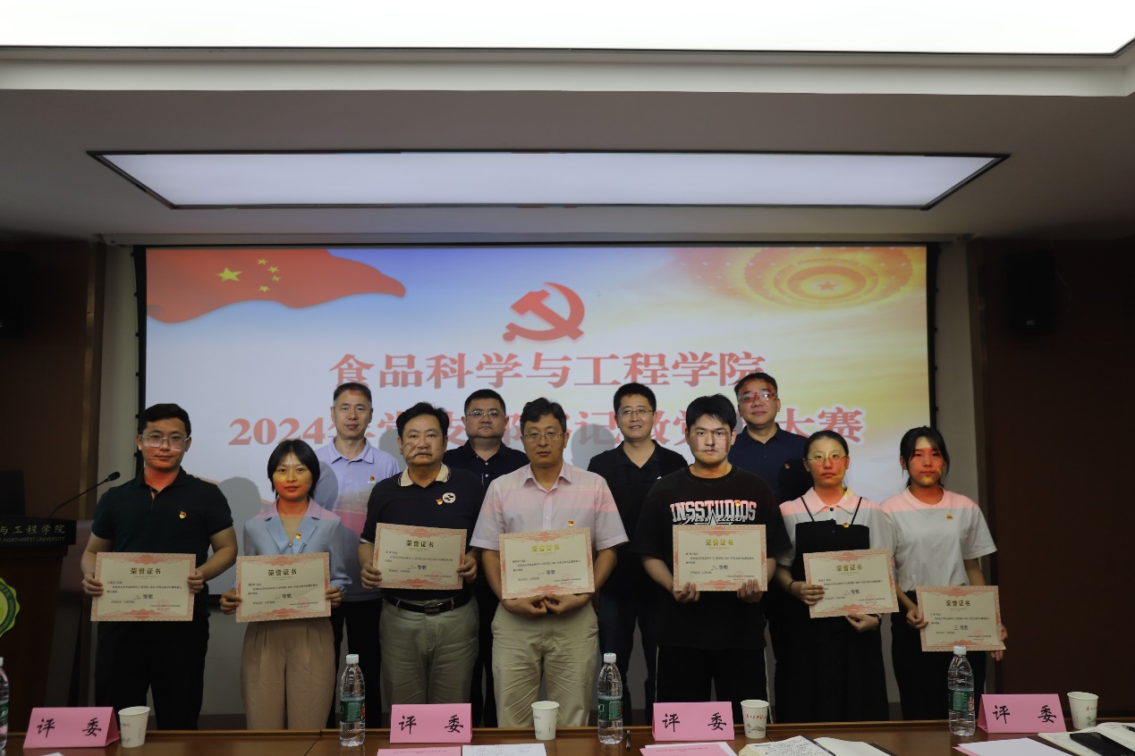经过激烈角逐,最终食品安全与质量控制党支部书记盛庆林获得一等奖;行政党支部书记张霄、食品营养学党支部委员龚桂萍获得二等奖;食品加工制造党支部书记白武双、2022级研究生党支部书记王贤、2023级研究生党支部书记高润、本科生党支部委员张竞文获得三等奖。与会嘉宾为获奖人员颁发证书。