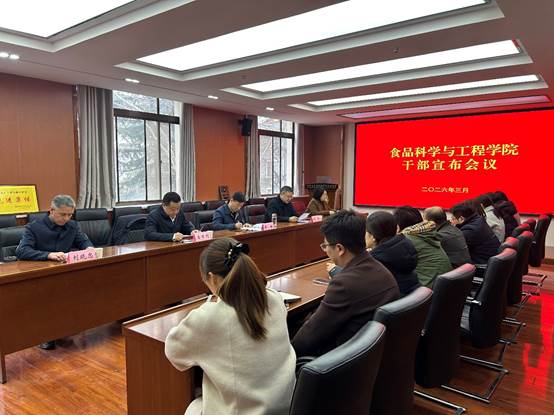 3月2日下午,食品学院干部宣布会议在太白校区举行。校党委书记蒋林,校党委组织部常务副部长周超出席会议,学院党政班子成员、科级干部和教师代表参加会议。会议由学院院长岳田利主持。会上,周超宣读了学校党委的干部任免决定,任命张茵为食品学院党委委员、书记;免去刘晓忠食品学院党委书记、委员职务。随后,刘晓忠作离任发言,张茵作履新发言,岳田利代表学院作表态发言。蒋林在讲话中对食品学院工作给予了肯定,高度评价...